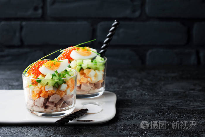 鳕鱼肝沙拉 有鸡蛋 黄瓜和红鱼子酱在玻璃 选择性焦点照片 正版商用图片0naz3y 摄图新视界